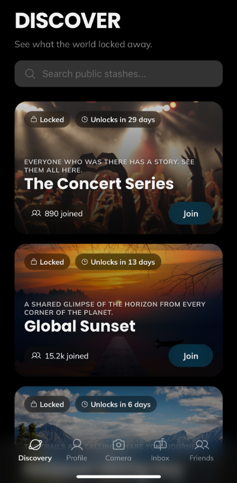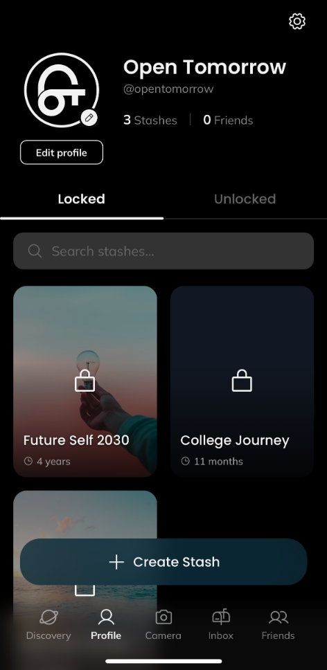 Create a Stash, set the date and time for when it will open. Store memories you want to savor or share with real people.
